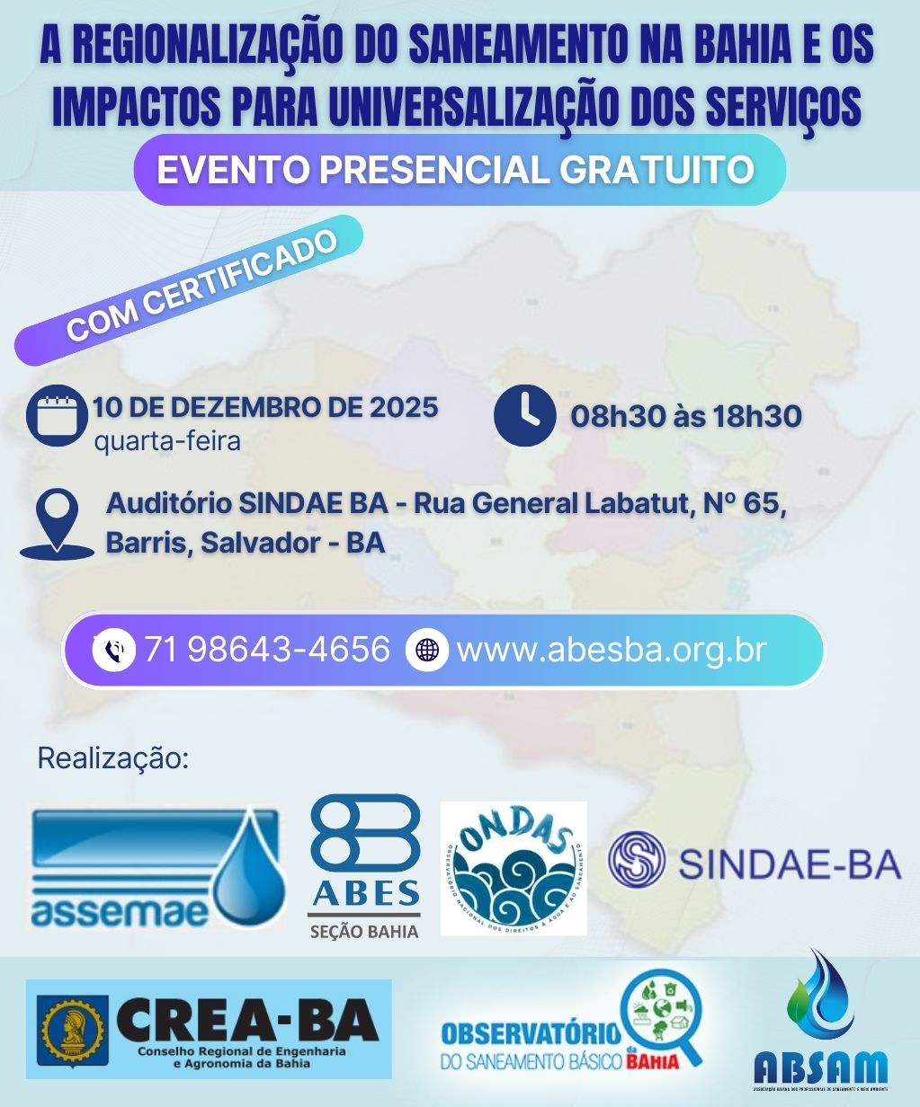 O evento objetiva fazer uma discussão sobre as propostas de regionalização do saneamento no Estado da Bahia, com a avaliação dos diferentes modelos propostos. O evento também objetiva fazer um debate sobre a legitimidade jurídica dos modelos perpassando pela autonomia municipal.