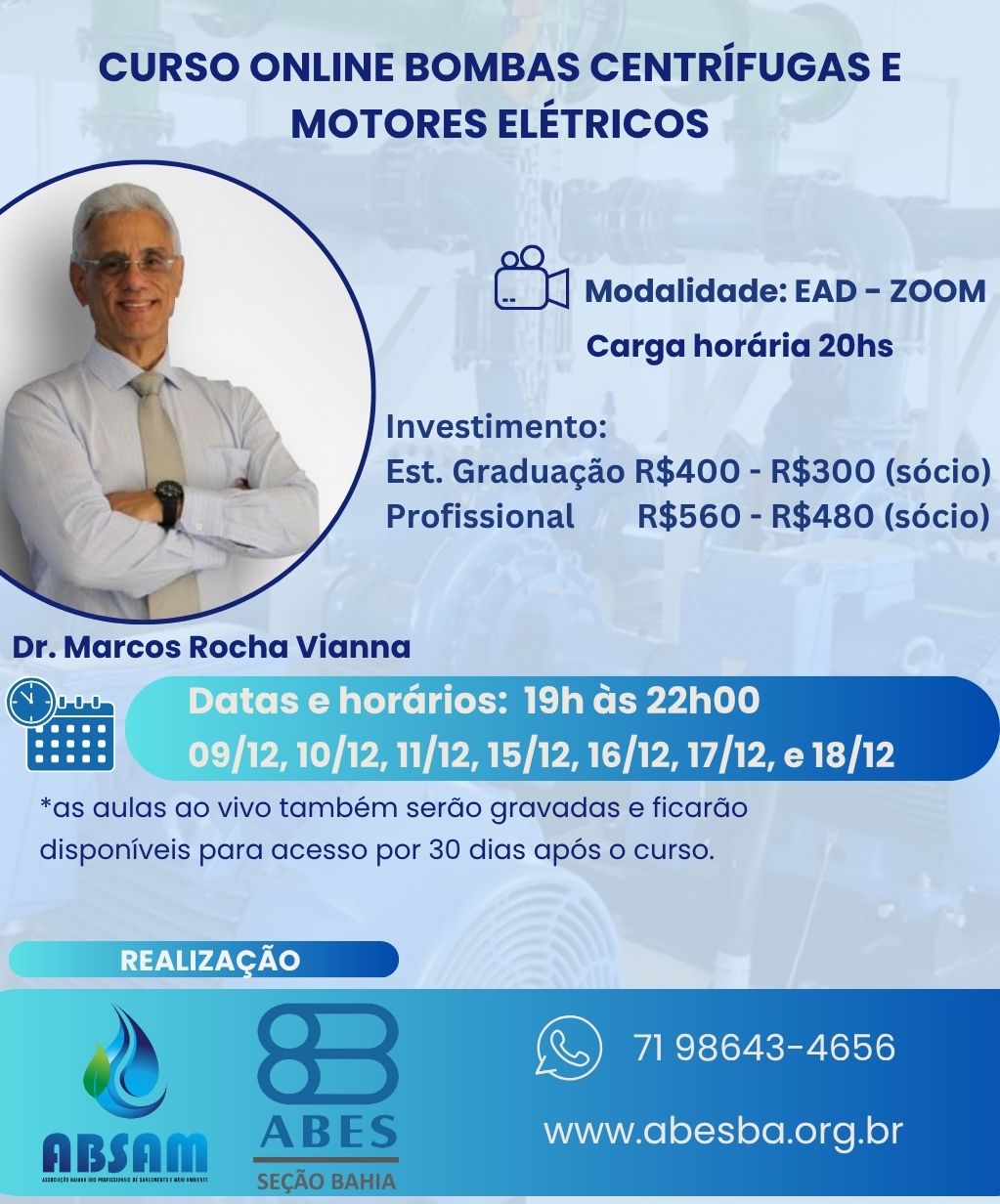 Fornecer aos participantes o conhecimento básico sobre as bombas centrífugas e os motores elétricos que as acionam, explicando de forma simples como são concebidos esses dispositivos e como funcionam. Ao longo do curso, serão apresentados diversos problemas resolvidos ilustrativos.