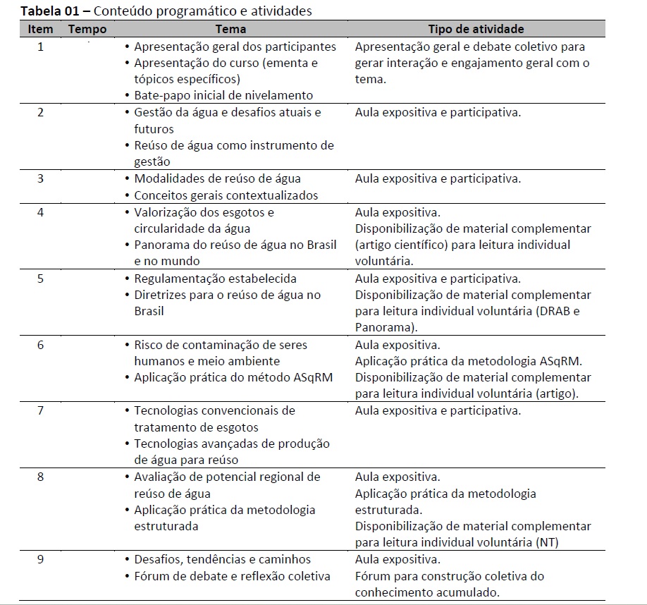O curso “Reúso de Água – Estratégias, Métodos e Técnicas” tem o objetivo de capacitar profissionais que atuam na área de água e saneamento, com uma visão de futuro e atentos aos novos desafios da gestão hídrica no mundo. Atualmente, é preciso repensar a forma como gerimos e produzimos água no século 21, em um novo cenário que envolve os impactos das alterações do clima, o crescimento populacional acelerado, a concentração populacional em cidades desorganizadas e os novos hábitos de consumo da sociedade. O curso envolve o conhecimento técnico-científico e prático da professora, acumulado em mais de 20 anos de experiência e atuação profissional na área, em contexto nacional e internacional. A metodologia pedagógica adotada é específica para esse tipo de treinamento, de modo a permitir entrosamento, apreensão de conceitos e possibilidade de replicá-los a situações similares com pares institucionais, garantindo a continuidade do processo de aprendizagem.